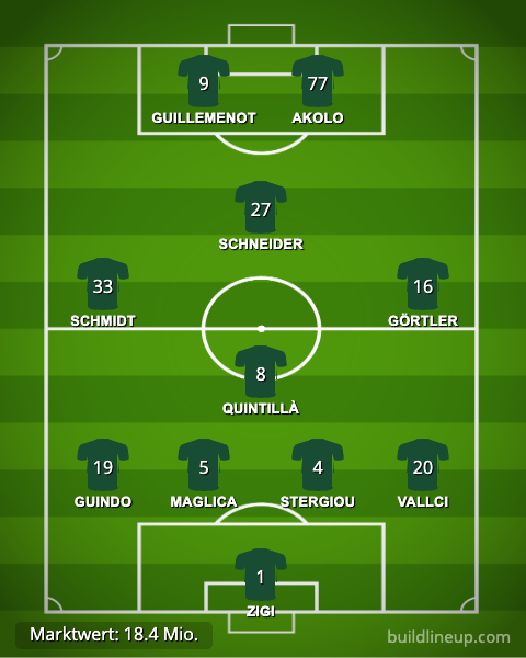 Gleich vier Stürmer sind verletzt, Guillemenot und Akolo sind daher gesetzt. Aus dem gleichen Grund bietet sich die Umstellung von 4-3-3 auf ein 4-4-2 an, wobei Schneider, Alves oder Karlen als hängende Spitze in Frage kommen. Das Tagblatt bringt sogar Basil Stillhart für die Position ins Gespräch.